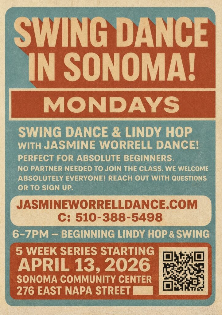 Thank you for the warm welcome, Sonoma. Our very first series sold out out well in advance, so we are coming back and doing it again (with new dance moves for even those in the current series!). We will be offering the next beginning swing series starting April 13, 2026. Tickets are on sale, so please register quickly as class will sell out! Thank you, again, Sonoma! We adore being offering classes in your gorgeous community center.